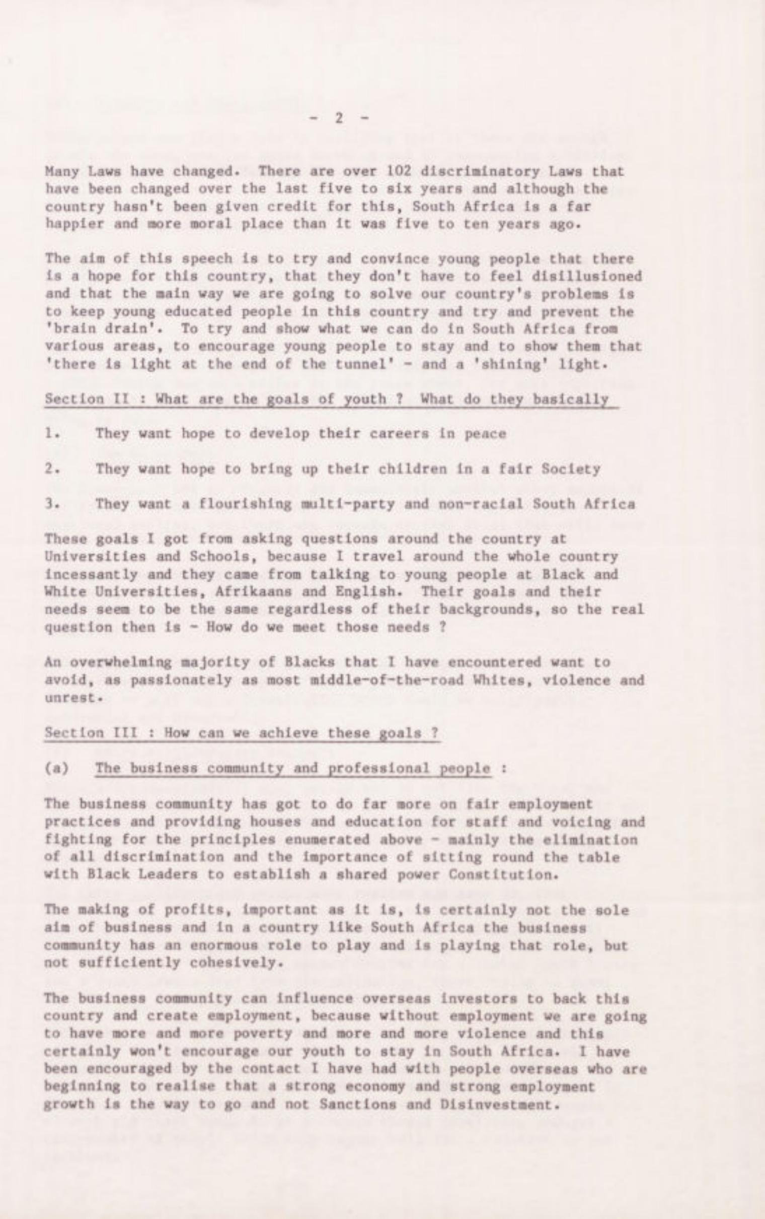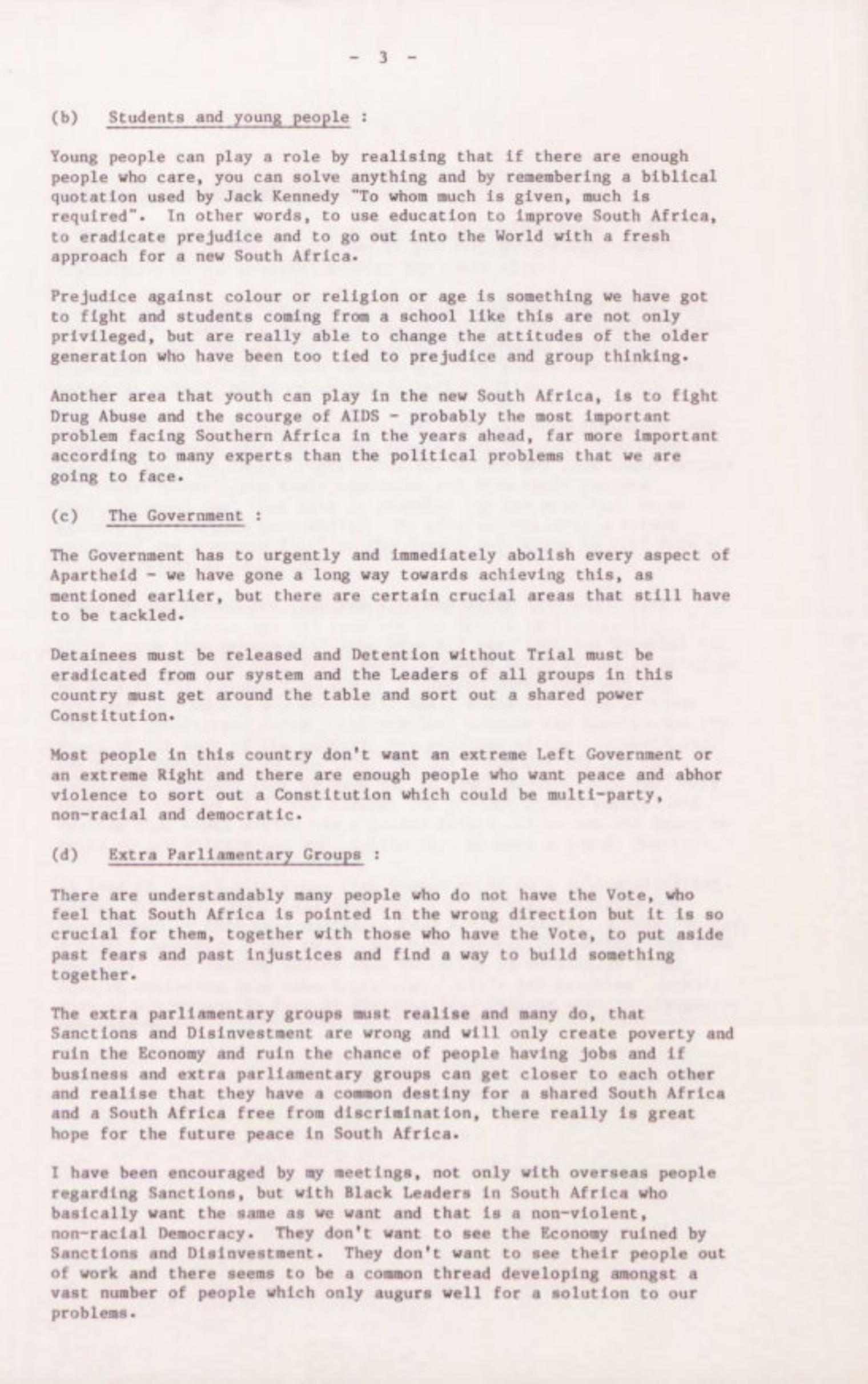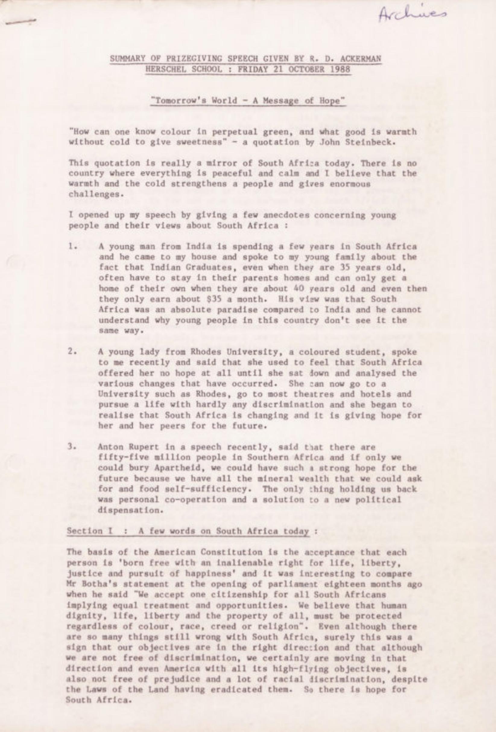 Description: Speech: Summary of Prizegiving Speech given by R.D. Ackerman Herschel School: Friday 21 October 1988. Tomorrow's World - A Message of Hope