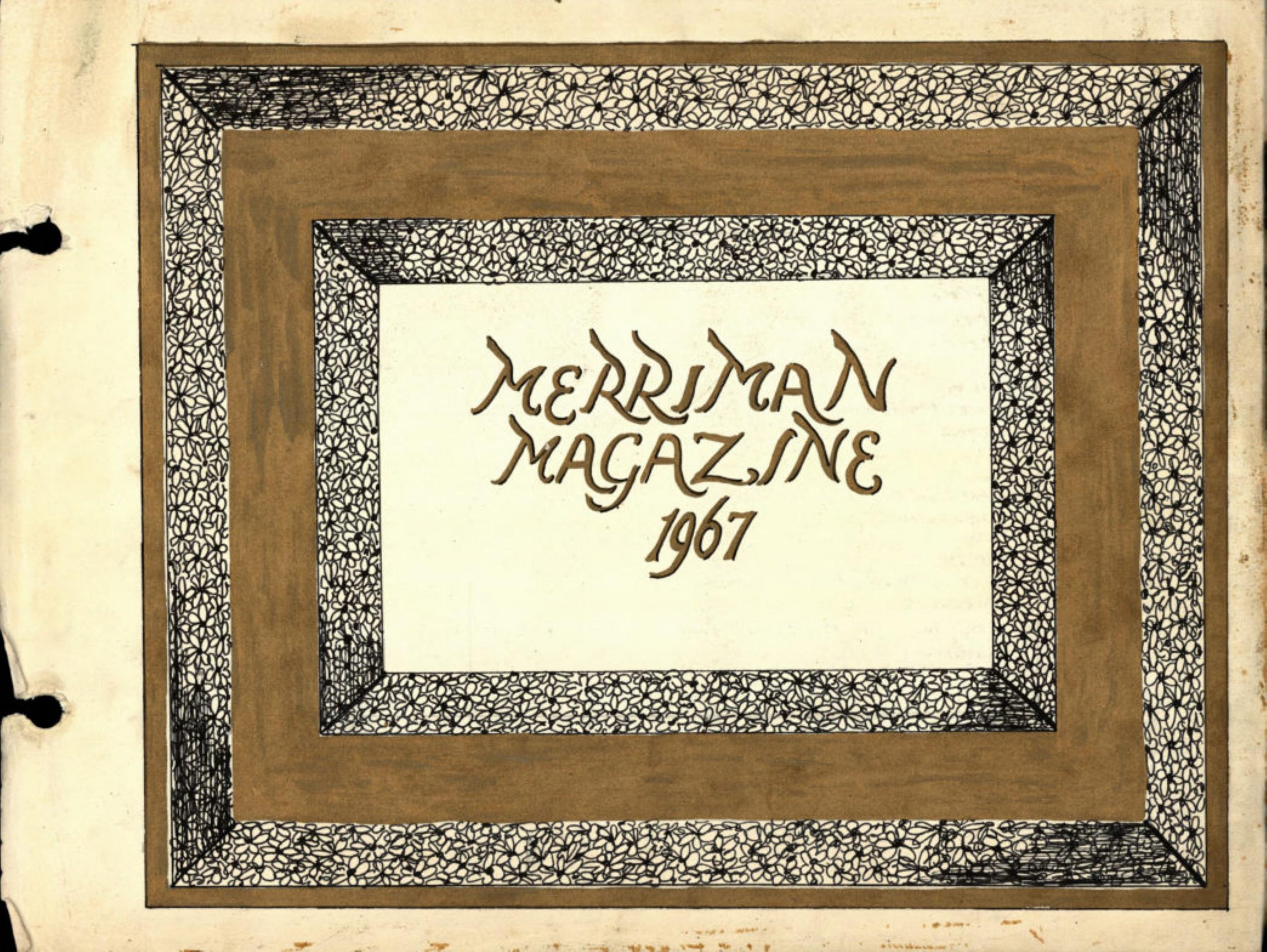 Description: House magazine: Merriman 1967 Red velvet cover with applied flowers and word Merriman in gold capital letters